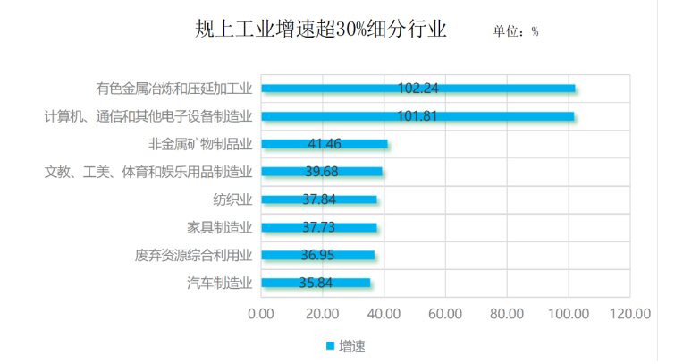 從規上工業看,化工及新材料、機電、醫藥、輕紡、農副產品加工等五大產業用電量全線飄紅,有色金屬冶煉和壓延加工業、電子設備制造業、非金屬礦物制品業、文教工美體育和娛樂用品制造業、紡織業、家具制造業、廢棄資源綜合利用業、汽車制造業等8個細分行業均出現35%到102%不等的增幅。 |