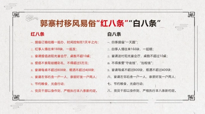 在宣堡鎮(zhèn)郭寨村,喜事連連中卻透露出不一樣的文明風(fēng)尚。結(jié)婚隨禮,這一傳統(tǒng)風(fēng)俗在這里有了新的詮釋。村里每戶人家的紅包都不超過200元,甚至有些人家還有零有整。這一變化,得益于村民共同遵守的郭寨村移風(fēng)易俗“紅八條”“白八條”。其中,“紅事人情往來188塊,一起發(fā)”的規(guī)定,更是讓村民們告別了過去的攀比之風(fēng),轉(zhuǎn)向了簡約、文明的辦事方式。 郭寨村還專門安排了“官方”集中地——宣堡鎮(zhèn)郭寨村“陽光宴會廳”,用于舉辦紅白事。2022年,該宴會廳平均每月接待1至2場,年接待人次達(dá)到1500人。這一舉措,不僅有效遏制了大操大辦、鋪張浪費的不良習(xí)俗,還促進(jìn)了村民之間的和諧相處。