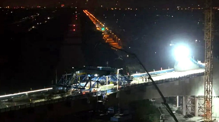 2024年12月9日晚10點(diǎn)58分,滬渝蓉高鐵通泰揚(yáng)特大橋跨越X355縣道及如泰運(yùn)河的連續(xù)梁開始了合龍作業(yè)。該連續(xù)梁全長(zhǎng)344米,采用主跨168米的連續(xù)梁跨越既有航運(yùn)通道和公路。由于施工周期長(zhǎng)、安全風(fēng)險(xiǎn)高、環(huán)保要求嚴(yán)、交通壓力大,該工程是項(xiàng)目中的關(guān)鍵控制性工程之一。