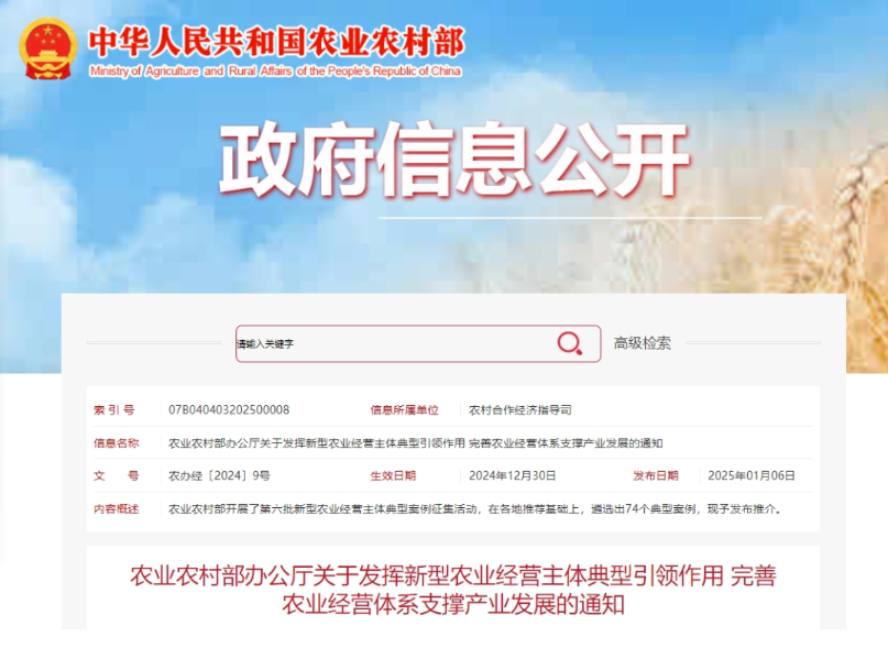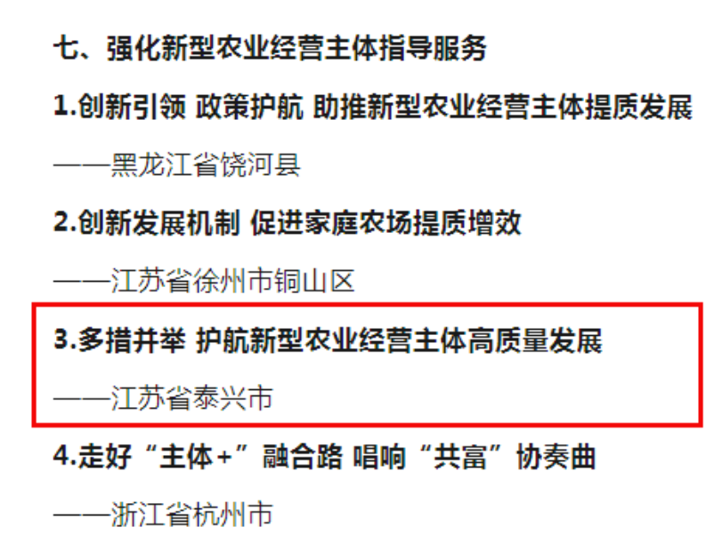 近日,農業農村部開展了第六批新型農業經營主體典型案例征集活動,在各地推薦基礎上遴選出74個典型案例,泰興案例《多措并舉 護航新型農業經營主體高質量發展》光榮上榜。