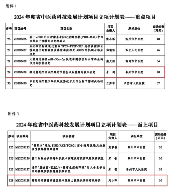 近日,江蘇省中醫(yī)藥管理局下達(dá)2024年度省中醫(yī)藥科技發(fā)展計劃項目立項計劃,泰興市共2個項目獲批,其中泰興市中醫(yī)院朱劍《探討筋針療法治療踝關(guān)節(jié)骨折術(shù)后腫痛的臨床研究》課題獲批重點(diǎn)項目,實(shí)現(xiàn)泰州重點(diǎn)項目“零”的突破。