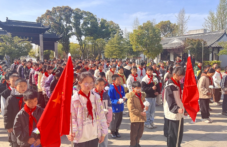 錚錚誓言映初心 “山河無恙,英雄永駐;請黨放心,強國有我!”在抗日陣亡將士紀念碑前,銀發老干部與少先隊員們并肩而立,共同舉起右拳,鏗鏘誓言穿透晨霧,久久回蕩在蒼松翠柏之間。“紀念碑旁蒼勁的青松,正是先烈守望故土的挺拔身影,我們要用青春澆灌理想的新芽!”泰興市南新小學學生凡事勤說。