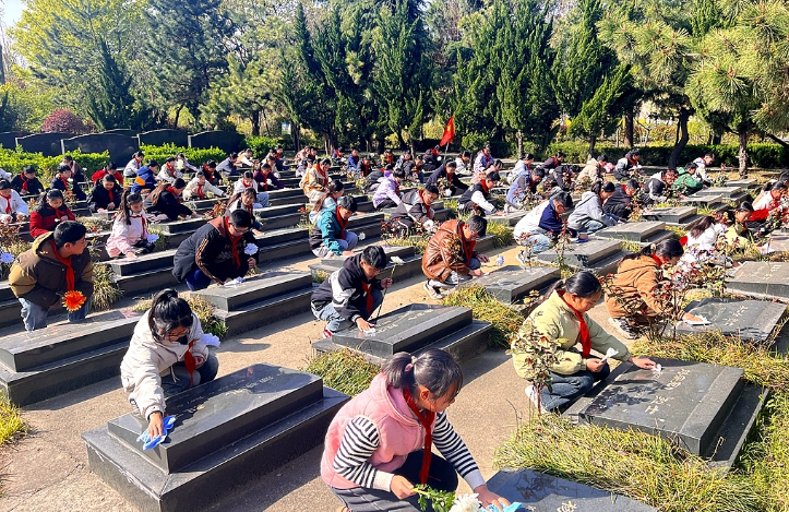 指尖致敬傳真情 在莊嚴肅穆的墓葬區內,學生們手持抹布,俯身輕拭烈士墓碑。“觸摸到墓碑的瞬間,我仿佛感受到了跨越時空的溫度,讓我懂得了什么是永恒的炙熱。”泰興市南新初級中學七(1)班學生葉洋濤感慨道。擦拭完畢,大家手捧鮮花,輕輕擺放在墓碑前,朵朵白菊寄托著深深的哀思與崇高的敬意。
