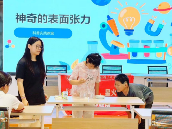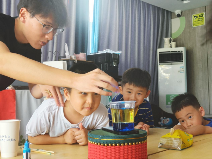 科普化學(xué)實驗室,動手實踐見真章 “紙上得來終覺淺,絕知此事要躬行”。實踐團(tuán)拋棄了傳統(tǒng)的課堂模式,不再局限于PPT講解和靜物陳列,而是更注重于將知識與實踐結(jié)合起來,讓“死氣沉沉”的知識“活”過來,讓孩子們能真正的“看得見,摸得著,學(xué)的懂”。成員通過“海底熔巖燈”讓孩子們更直觀的“看見”二氧化碳,并理解什么是密度差導(dǎo)致分層;通過“水的特性實驗”讓孩子們知道水的“形狀”和溶解性,并培養(yǎng)孩子們節(jié)約用水的良好習(xí)慣;通過“磁力小車”向孩子們講解什么是磁場,讓他們思考小車為什么突然就動起來了等等。課堂上孩子們目不轉(zhuǎn)睛眼中充滿了對知識的好奇與渴望,“我們只想在能力范圍內(nèi)盡最大努力讓孩子們領(lǐng)略科學(xué)的魅力。”實踐團(tuán)成員說道。 開綠村 吳文昕開展科普實踐 北站社區(qū) 佘健山開展化學(xué)課堂 星光公益咖吧 侯世典開展化學(xué)課堂海底熔巖燈