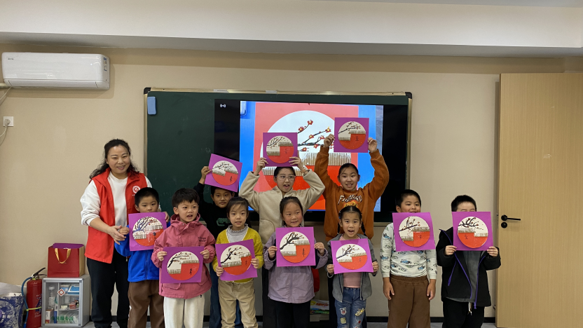 過程中,孩子們互相幫助、盡情發揮——有的細致裝飾屋檐,有的用墨色濃淡表現梅枝姿態,還有的認真題寫“立冬”字樣。志愿者從旁鼓勵、協助,現場洋溢溫馨與歡笑。完成作品后,孩子們踴躍展示并分享構思,眼中充滿成就感。