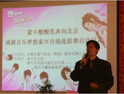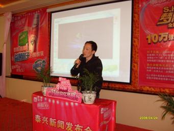 2008年4月24日下午4點,蒙牛乳業泰興總代理——泰興市瀛海威商貿有限公司在泰興市廣電中心召開了2008年蒙牛酸酸乳“奔向北京·成就音樂夢想”選拔賽新聞發布會,此次新聞發布會的召開也標志著2008年蒙牛酸酸乳“奔向北京·成就音樂夢想”選拔賽路演在泰興全面的展開。
