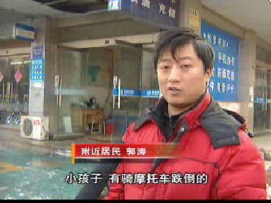 附近居民郭濤說:“上面壞掉了三四個太陽能,有師傅上去看了,到今天也沒有人來維修。” 根據附近居民反映,漏水是從14日下午開始的,位于5樓的下水管道接口處有明顯的斷裂,太陽能里漏出的水從這個缺口流了下來。住在附近的市民郭先生實在看不下去了,主動找來太陽能修理工幫著修理。 郭濤說:“昨天晚上我找的專門修太陽能的師傅,上去把下水堵起來了,現在還有點漏。” 流到地面的水在夜里很快就結成了冰,不少從這里經過的人遭了殃。 郭濤說:“騎車子的,老頭子、老奶奶、小孩子跌跟頭的太多了,還有騎摩托車跌倒的,有騎電動車跌倒的! 而更讓人擔心的是高高懸掛著的冰凌,隨時有掉下來的危險。 郭濤說:“它馬上要解凍,化凍以后,如果有風一吹掉下來,要是下面有人在,掉在人頭上,會對人的生命有威脅,要盡快想辦法把它處理掉! |