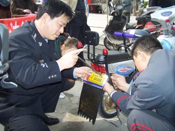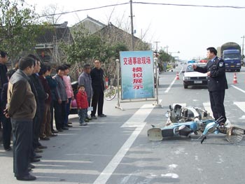 3月20日,泰興張橋鎮褚陳村村頭廣場好熱鬧,村上男女老少都推著自家的新電動車來“趕集”。原來,泰興公安交巡警大隊張橋中隊“志愿者服務隊”在這里正進行志愿服務活動。他們選擇轄區事故多發的村莊進行交通事故殘骸展、模擬交通事故現場,面對面的對群眾進行交通安全宣傳,發放“村民交通安全出行須知”,為農戶新購的電動車辦理牌證業務,受到了群眾的贊揚。(廖志鋒 黃新麗)