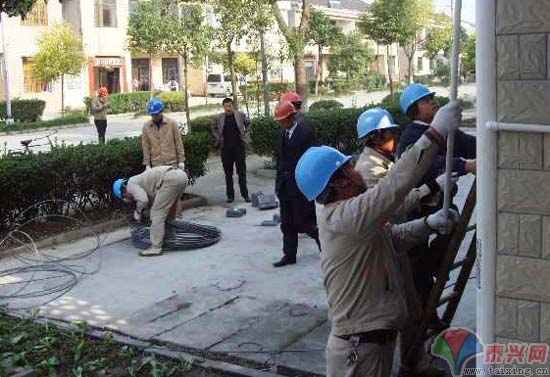圖為施工人員正在蔣華鎮六圩村實施進戶線改造施工。