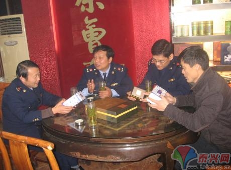 圖為工商執法人員與個私茶社老板講解茶葉知識,引導他們從源頭把好進貨關,杜絕劣次茶葉進入泰興春節市場,同時希望個私業主如何做大做強,做好做優,創大牌創名牌。