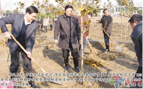 3月11日上午,市四套班子負責人參加義務植樹活動,以實際行動倡導全市上下快速掀起植樹造林活動熱潮,迎接植樹節的到來。 春寒料峭,田間泥濘。100多名機關干部參加了上午的義務植樹活動。市委書記張兆江穿著雨靴親手栽下一株株樹苗,并打堰澆水。大家有的揮鍬鏟土,有的扶樹澆水,半個小時左右,寧靖鹽高速公路溪橋段節點景觀帶上便形成了整齊的綠色屏障。這次義務植樹活動共栽植廣玉蘭等名貴苗木4000多株,綠化面積近30畝。 市委書記張兆江說:“植樹造林是美化家園、綠化泰興的一個好行動,希望廣大市民都能參與到建設生態泰興的行動當中來,走出戶外參與植樹造林。” 近年來,我市以建設人與自然和諧的生態家園為目標,全力推進“生態泰興”建設,而作為生態泰興建設的重要內容——綠化工作今年要求更高,全市將新增林業面積1.3萬畝,栽植各類樹木300萬株,使全市森林覆蓋率進一步提高。 當地村民高興地說,植樹造林是有利于子孫后代、能夠改變生態環境的好事,所有的村民都愿意參加到植樹造林活動當中來,把環境打造得更加美好。 |