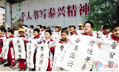 為進一步提高新時期泰興精神的知曉率、認同度,4月24日上午,我市舉行千人書寫“泰興精神”活動,市領導戴仁泉、王中先、楊晉安、張春山出席。 在鼓樓文化廣場,1000多名小學生現(xiàn)場揮毫,書寫“厚德開泰 、奮發(fā)圖興”的新時期泰興精神。 市委常委、宣傳部部長戴仁泉指出,這次活動是全市深入開展泰興精神宣傳實踐活動的一個具體行動,他希望參與活動的學生們充分發(fā)揮“小手拉大手”的作用,推動泰興精神的學習、宣傳、實踐,進家庭、進校園、進社區(qū),進而在全社會形成弘揚、踐行泰興精神的濃厚氛圍。 在一張張白紙上,孩子們寫下了各種書法字體的“厚德開泰、奮發(fā)圖興”,字里行間滲透著孩子們對泰興精神的理解,對家鄉(xiāng)的熱愛。 |