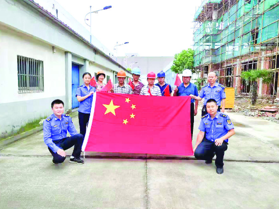 ![]() 市城市管理綜合執(zhí)法大隊的隊員們來到建筑工地,和建筑工人們一起與國旗合影。
