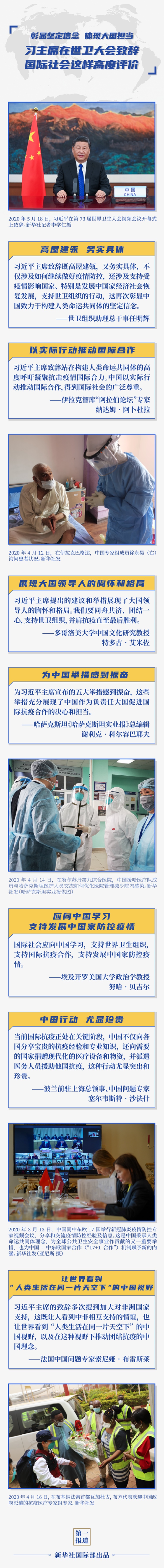 新華社北京5月19日電 5月18日晚,習近平主席在第73屆世界衛生大會視頻會議開幕式上發表題為《團結合作戰勝疫情共同構建人類衛生健康共同體》的致辭。習近平主席在致辭中提出加強疫情防控六項建議以及中國為推進全球抗疫合作五大舉措,彰顯了中國致力于構建人類命運共同體的堅定信念,體現了中國積極推動全球抗疫合作的大國擔當,得到國際社會積極呼應和高度評價。