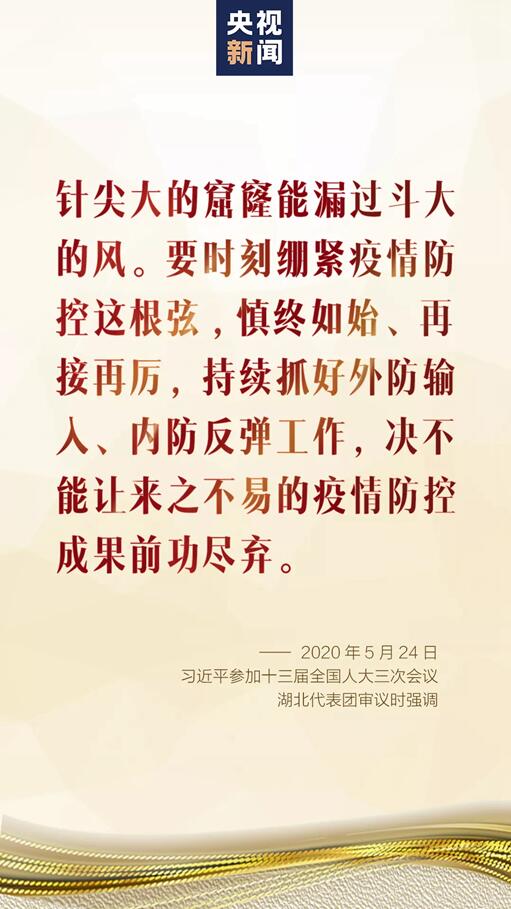 習(xí)近平24日下午在參加十三屆全國(guó)人大三次會(huì)議湖北代表團(tuán)審議時(shí)強(qiáng)調(diào),防范化解重大疫情和突發(fā)公共衛(wèi)生風(fēng)險(xiǎn),事關(guān)國(guó)家安全和發(fā)展,事關(guān)社會(huì)政治大局穩(wěn)定。