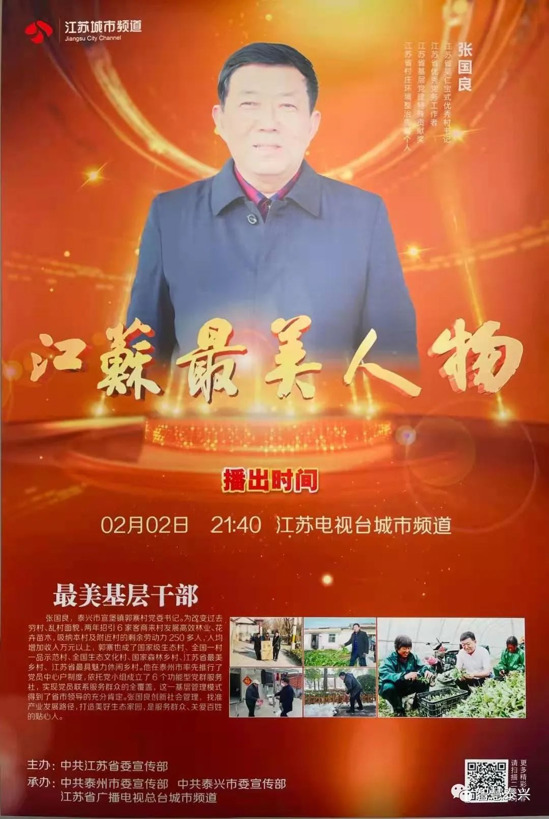 近年來,我市在經濟社會高質量發展的進程中,注重弘揚凡人善舉,培育和踐行社會主義核心價值觀,注重典型選樹宣傳,發揮典型示范引領作用,精心打造“點贊泰興人”、“兩講兩樹兩爭”等典型選樹品牌,全市先后涌現出2名“新時代奮斗者”,2名全國道德模范提名獎獲得者,1名全國最美人物,4名江蘇最美人物,19名中國好人、24名江蘇好人,300多人獲得泰州市級以上最美人物、道德模范等榮譽。 江蘇“最美基層干部” 張國良先進事跡 將在 2021年2月2日21:40 江蘇電視臺城市頻道播出 敬請收看