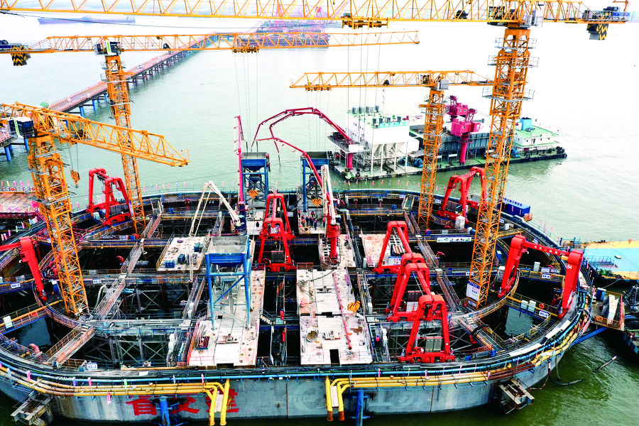 (記者 周冰 通訊員 凌鴻茹)春節期間,在常泰長江大橋5號墩沉井施工現場,一臺臺混凝土攪拌車排成長龍,通過傳送泵向五號墩輸送著混凝土。在墩沉井附近,幾艘浮吊船正停靠在旁,不斷揮舞著“手臂”進行作業,工人師傅們按照現場技術專家的要求進行面層澆筑、構件架設等工序施工,整個現場焊花飛舞、機聲隆隆,一片繁忙的景象。