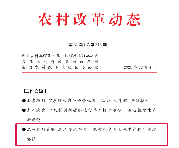 & 8203;近日農(nóng)業(yè)農(nóng)村部《農(nóng)村改革動(dòng)態(tài)》就姜堰激活多元要素探索糧食大面積單產(chǎn)提升實(shí)現(xiàn)路徑進(jìn)行推介近年來(lái),泰州市姜堰區(qū)扎實(shí)推進(jìn)國(guó)家糧食生產(chǎn)重要功能區(qū)建設(shè),深刻踐行藏糧于地、藏糧于技戰(zhàn)略,聚焦人、地、技關(guān)鍵生產(chǎn)要素,系統(tǒng)謀劃、協(xié)同發(fā)力,著力破解單產(chǎn)提升瓶[詳細(xì)]
